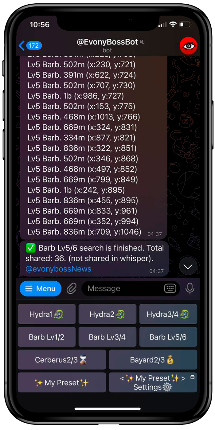 Make your own preset with bosses you want. Choose a distance limit and amount of bosses you want to get. Bot will search for bosses according to your list and search range.